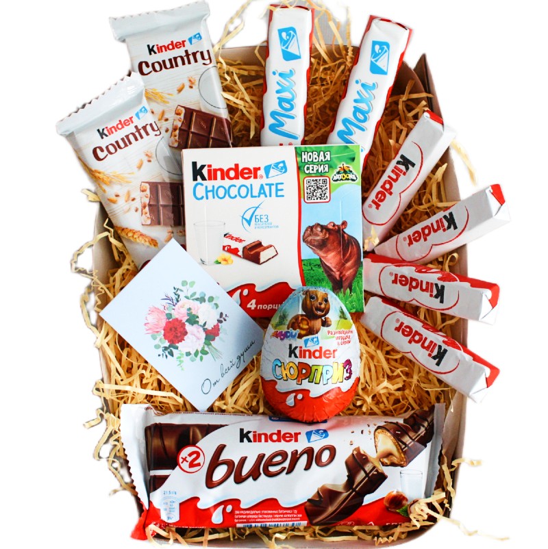 Набор вкусняшек Киндер идеально подойдет в качестве подарка для любого повода: ребенку, подростку, взрослому. В дополнение прикладываем нейтральную открытку, которую можно подарить кому угодно по любому поводу, как детям, так мужчине и женщине. Состав конфет максимально разнообразный, в наборе вы найдете: